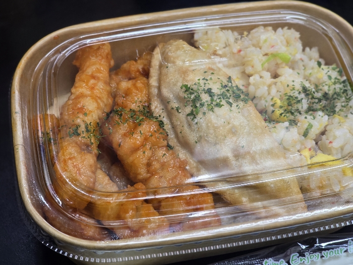 도시락의 구성은 탕수육, 갈릭볶음밥, 그리고 만두로 이루어져 있습니다.