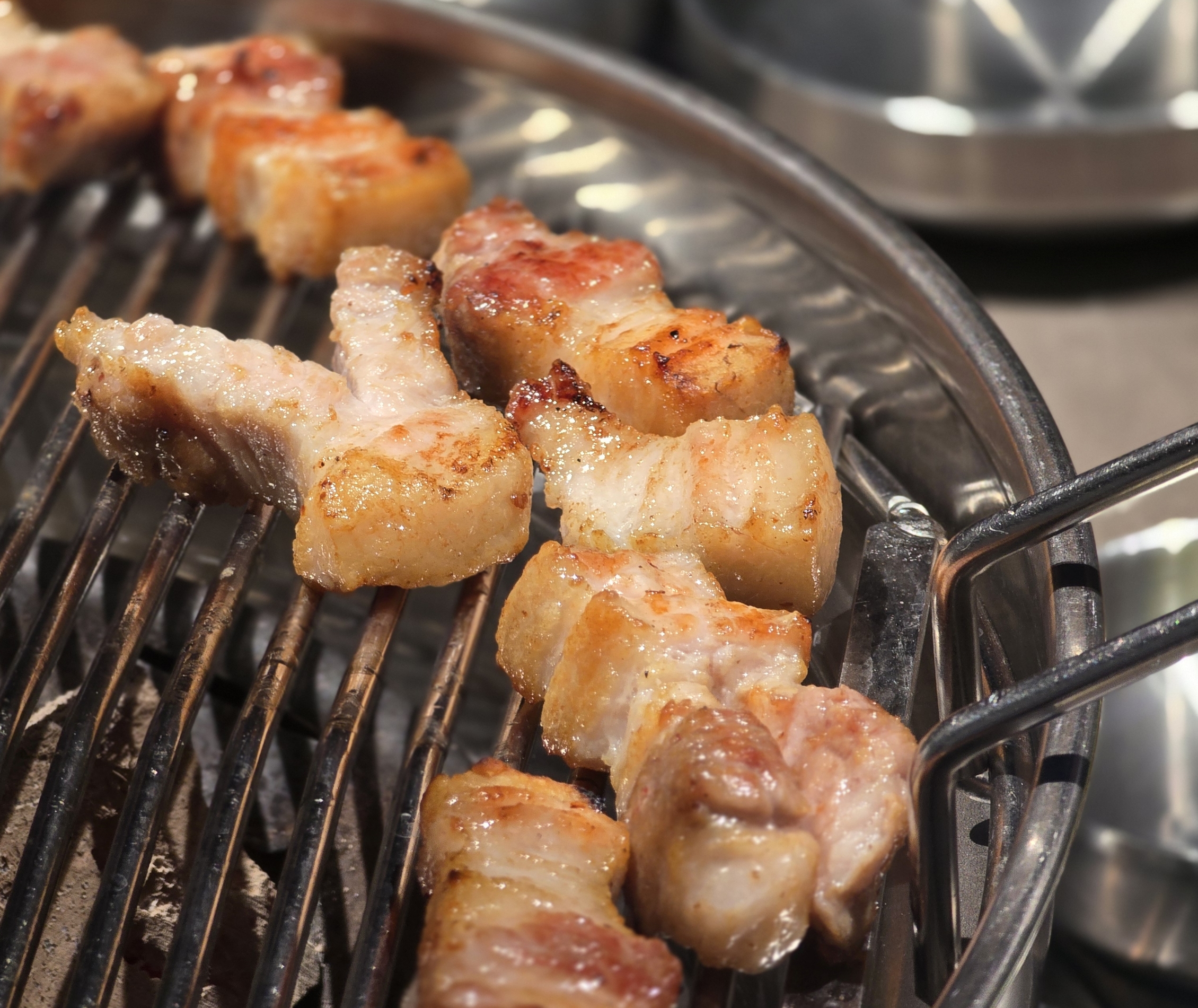 삼겹살: 두툼하고 고소한 맛! 육즙이 살아 있어요.