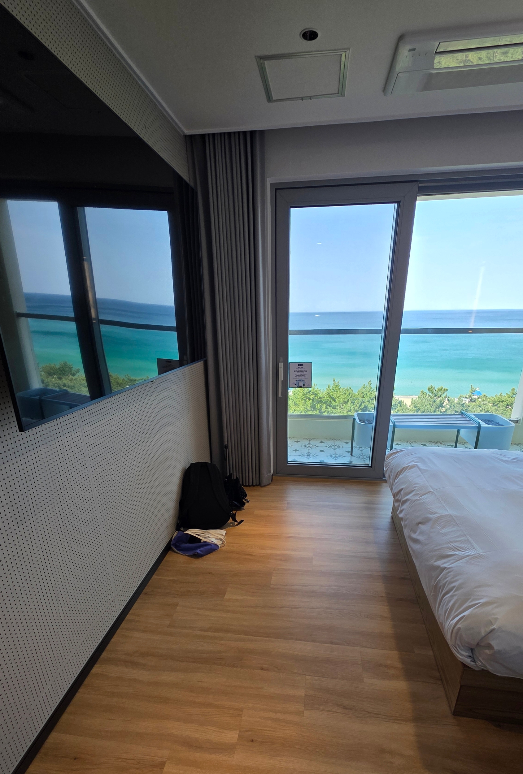객실은 모던하고 따뜻한 톤의 인테리어로 꾸며져 있었고, 오션뷰 발코니가 기본 제공돼요.