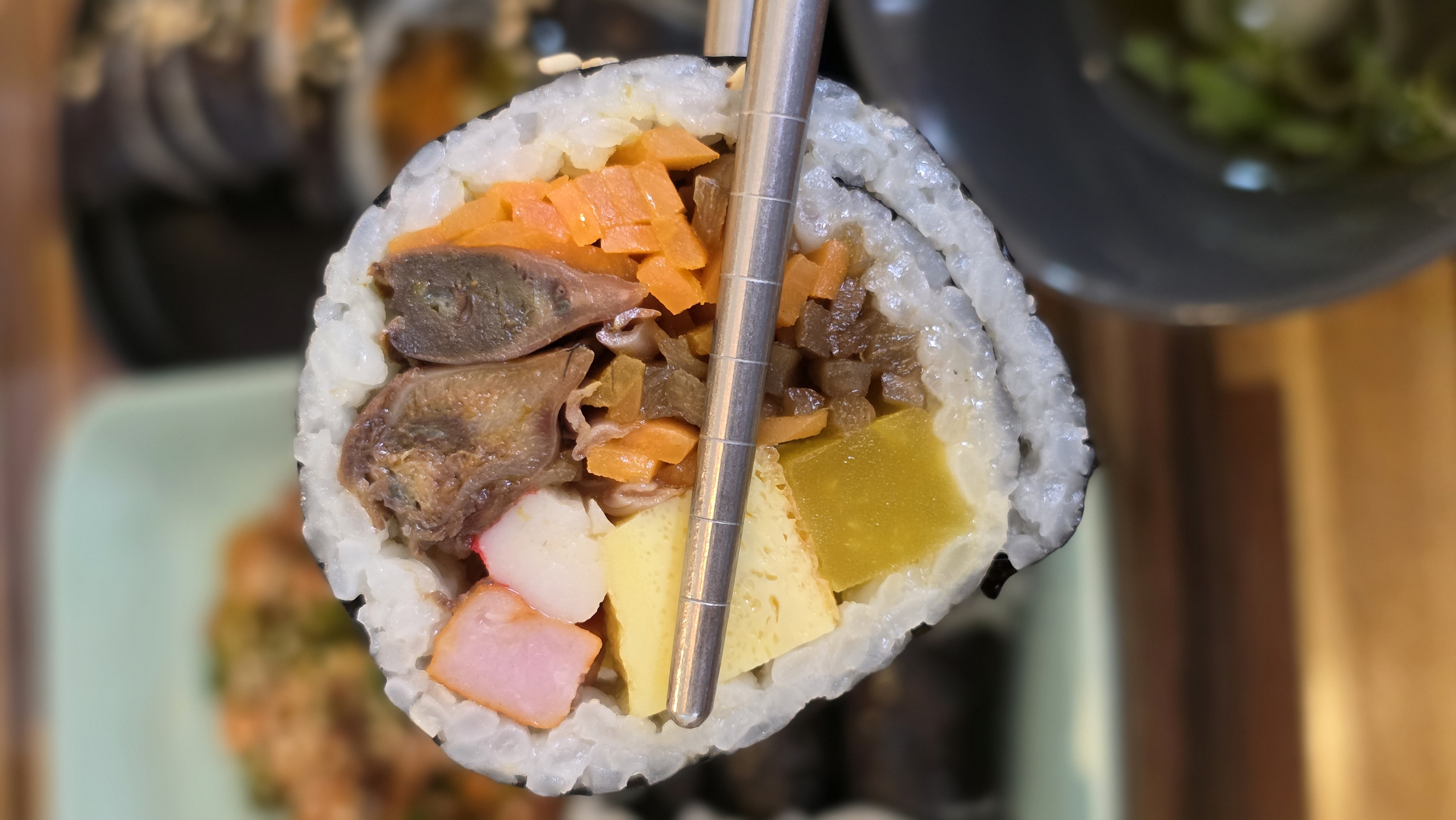 – 사진 속 꼬막김밥 한 줄은 고소한 단무지, 계란지단, 당근, 우엉, 맛살이 알차게 들어있고, 굵은 꼬막살이 단단히 박혀 있어 바다 향 가득합니다.
