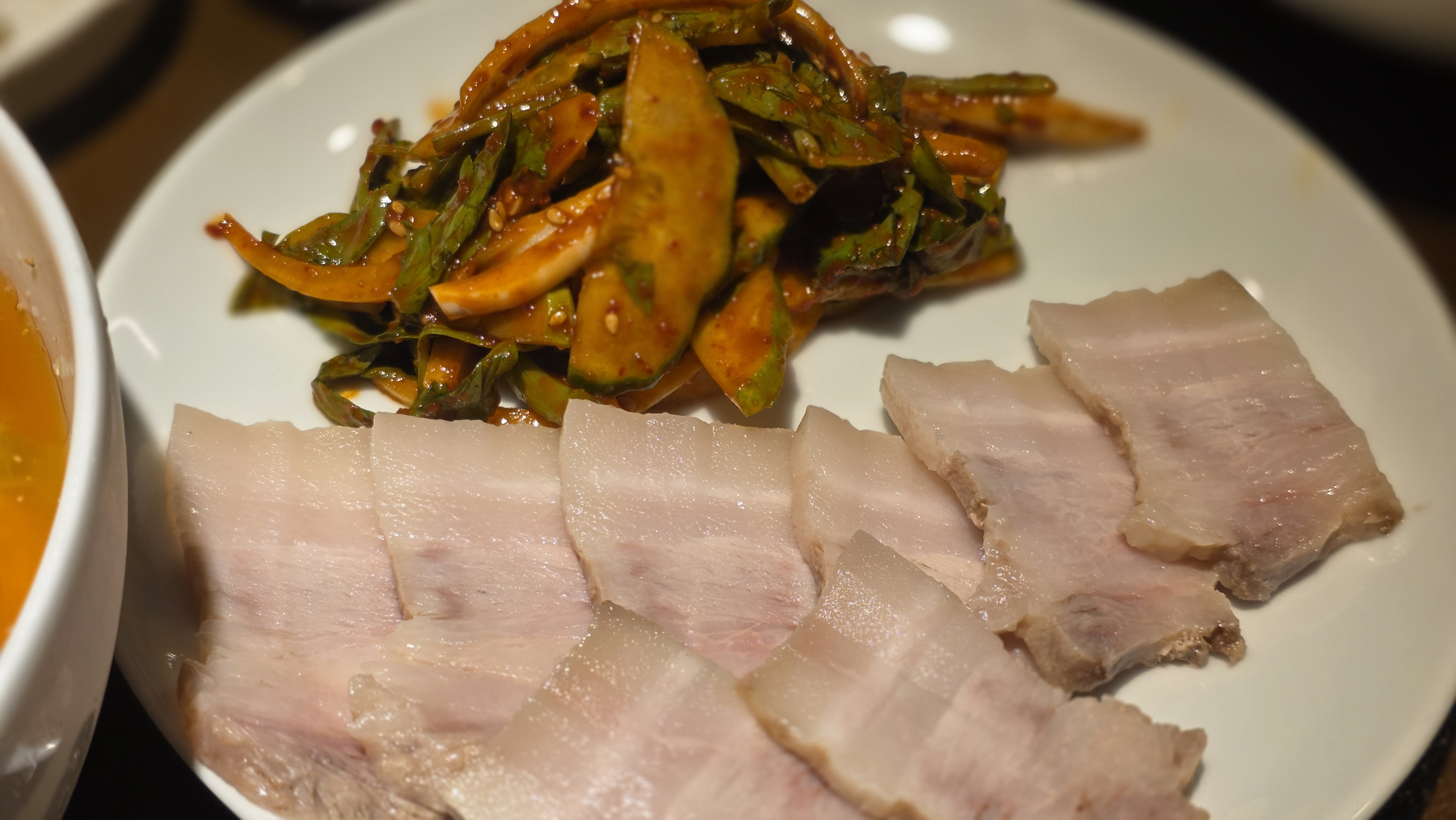얇게 썬 담백한 수육 위에 오이와 부추를 양념해 올린 메뉴입니다.