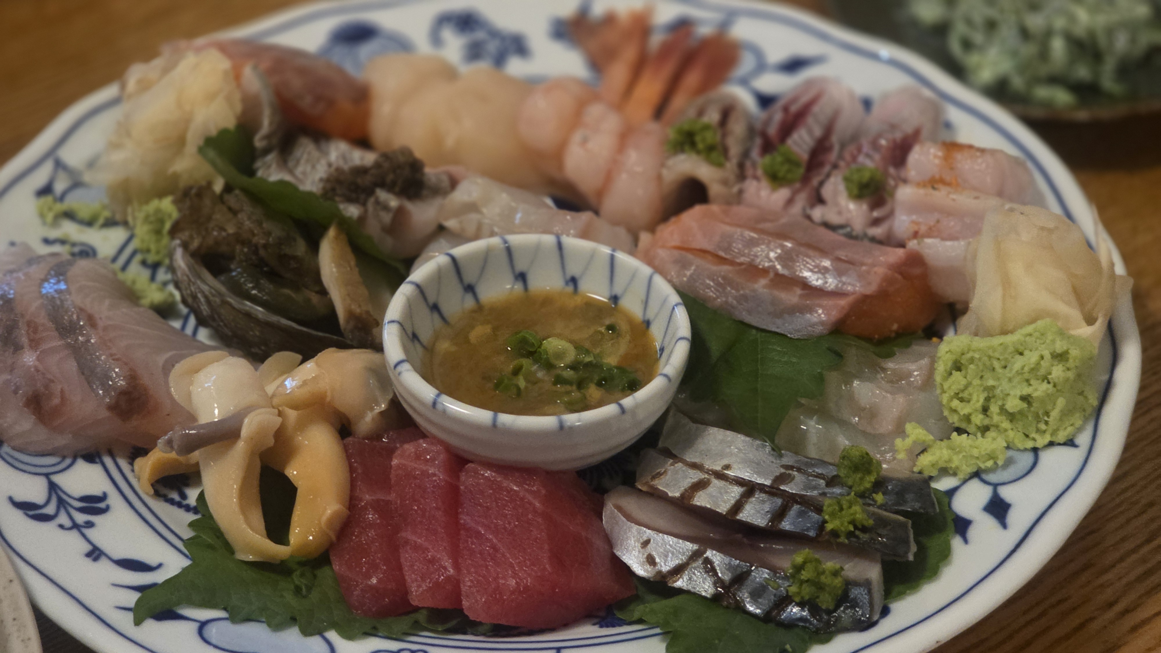 구성은 참치·광어·연어 등 다양한 생선으로, 간장과 직접 갈아낸 와사비까지 정성스러워요.