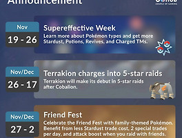 | [한국][서울] 2019년 11월 이벤트 정리(Supereffective week/Friend fest/전설레이드5성 테라키온) (1) | 2019.11.14 |