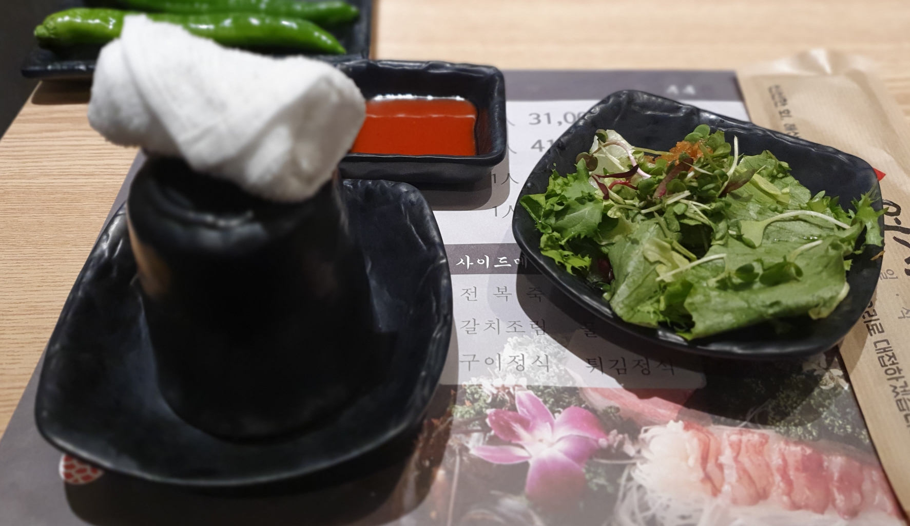 야채는 쌈추와 고추, 마늘쫑 등이 있고 기본찬인 단무지, 락교, 고추, 초생강등이 보입니다.