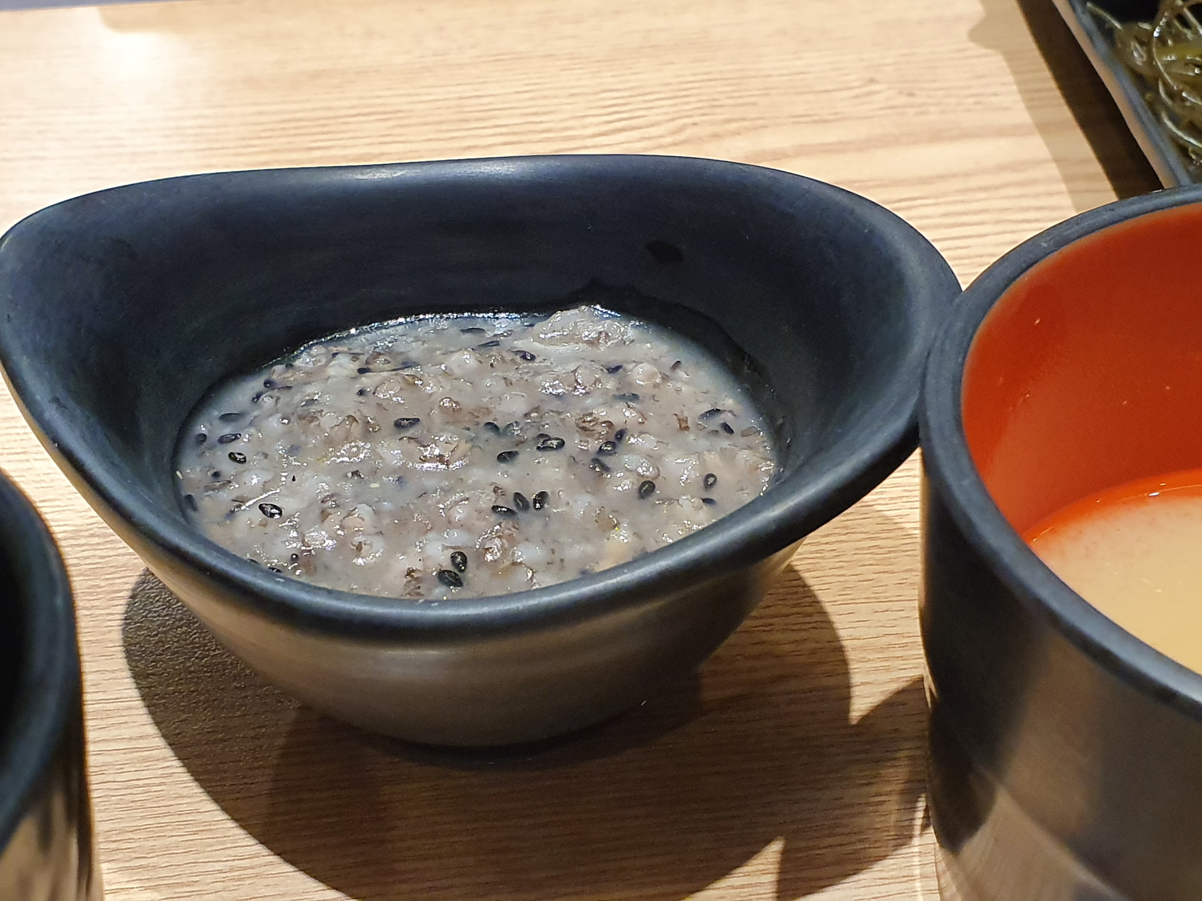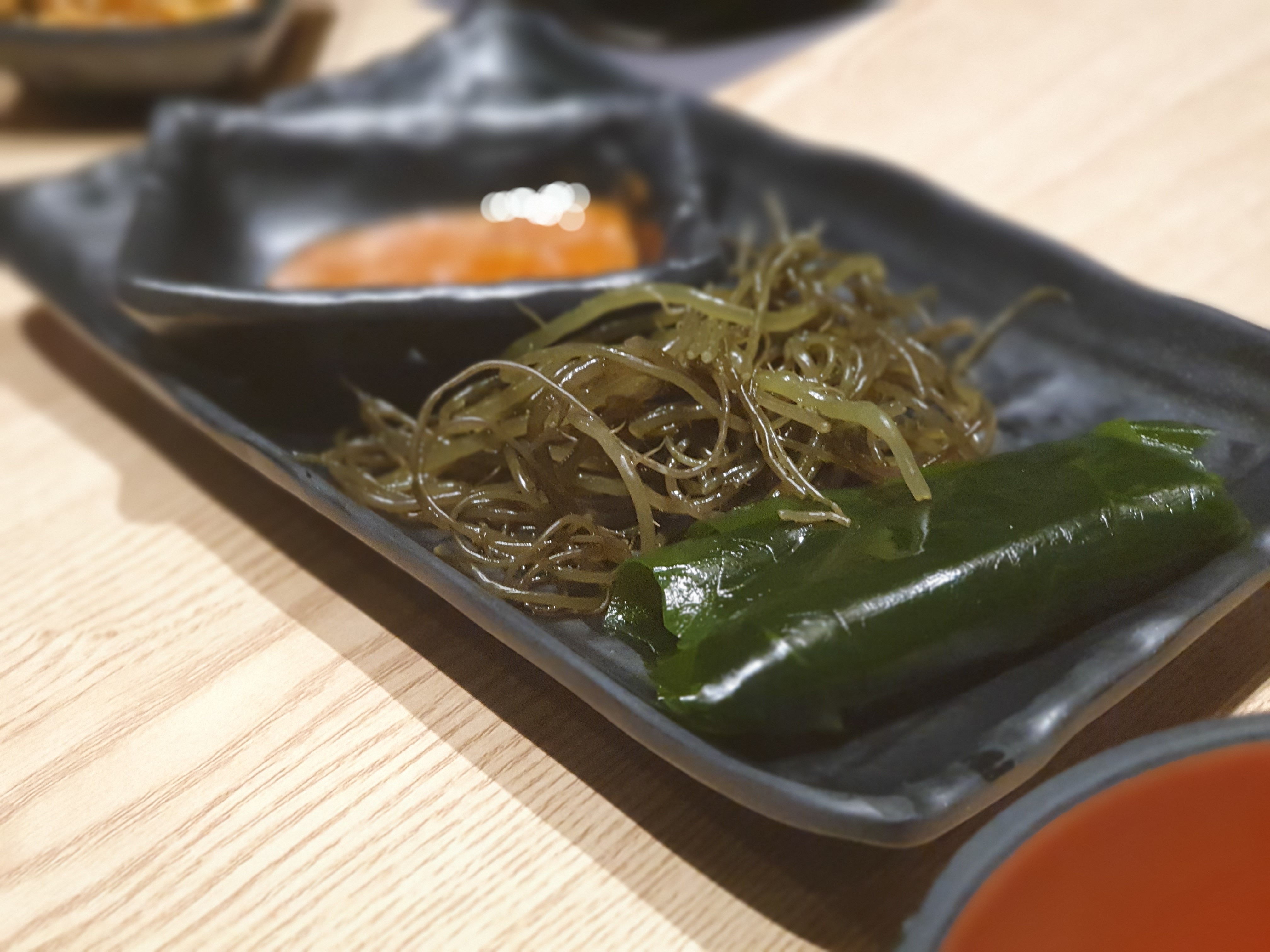 밑반찬으로는 다시마와 미역이 있는데, 뒤에 보이는 것은 된장이나 막장은 아닙니다.