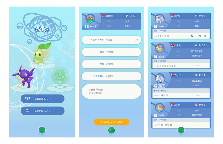 GTS는, Global Trade System의 약자로서, 본인이 원하는 포켓몬을 적어두고, 다른 유저가 그 포켓몬 조건에 맞는 포켓몬과 맞교환을 하는 시스템입니다.