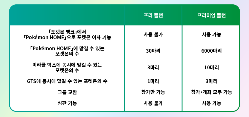 좀더 자세히 알아보면, 포켓몬 홈은 유료/무료에서 기능 차이가 있습니다.