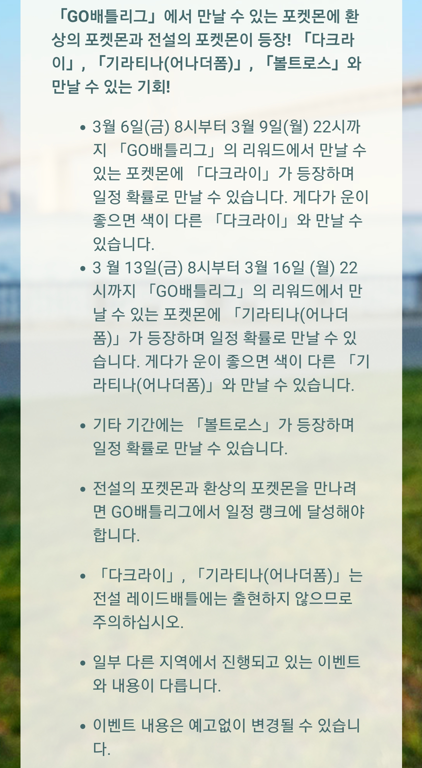 | [포켓몬고] 2020년 3월 일정 공지 (0) | 2020.03.12 |