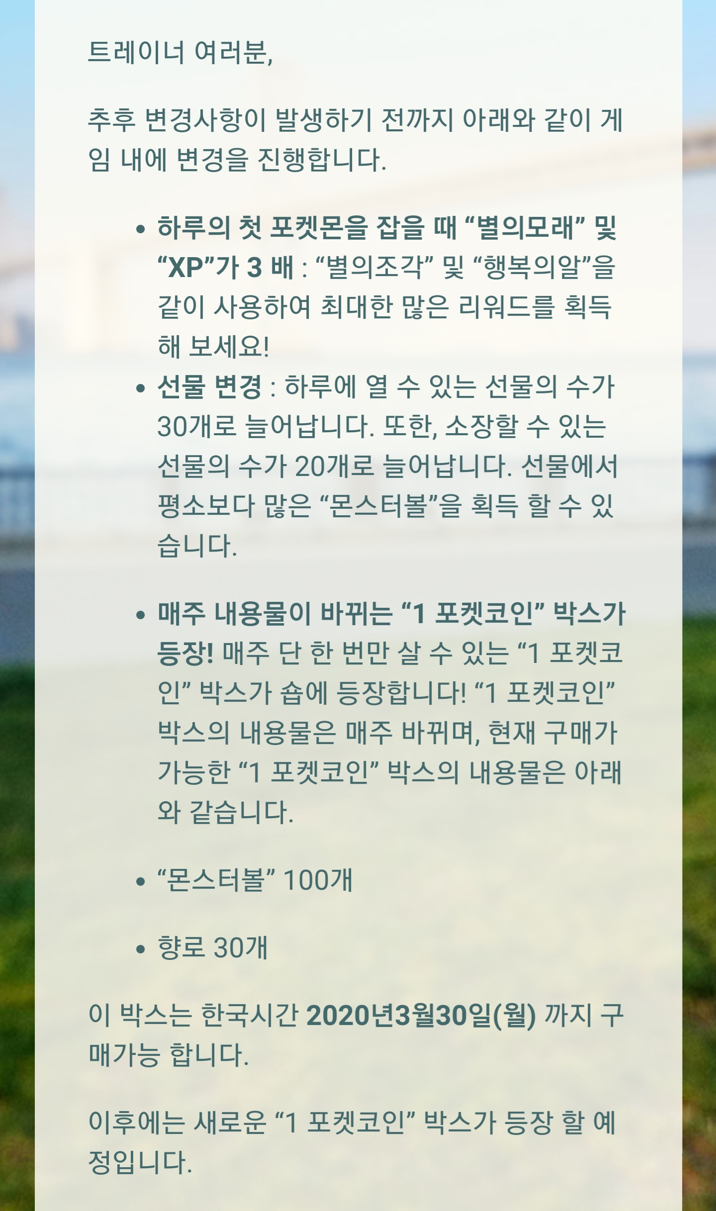 이로 인해 불편함을 조금 상쇄해 주기 위하여 나이언틱이 그날그날의 첫번째 포켓몬의 포획 모래와 경험치를 3배로 받도록 적용시켜져 있는 상황입니다.