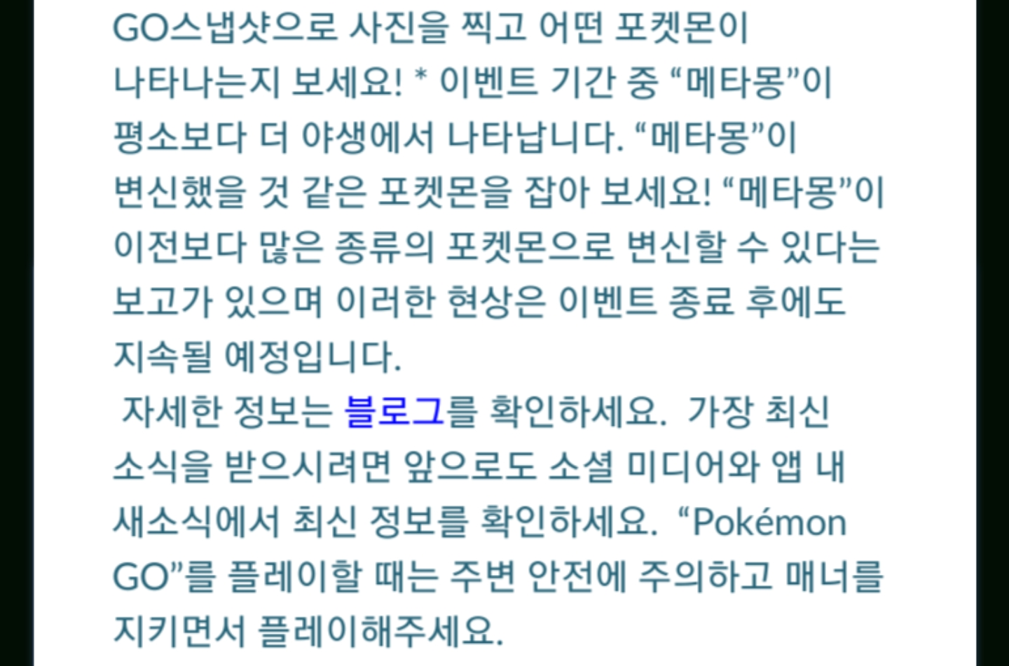 안녕하세요. 오늘은 앞서 업데이트가 예고된 스냅샷고(스냅샷Go)를 통한 AR사진 기능 업데이트에 대해 설명해 드리겠습니다. 포켓몬고에서는 잡을 때만 포켓몬과 AR모드를 사용할 수 있었습니다. 그래서 아쉬운점..