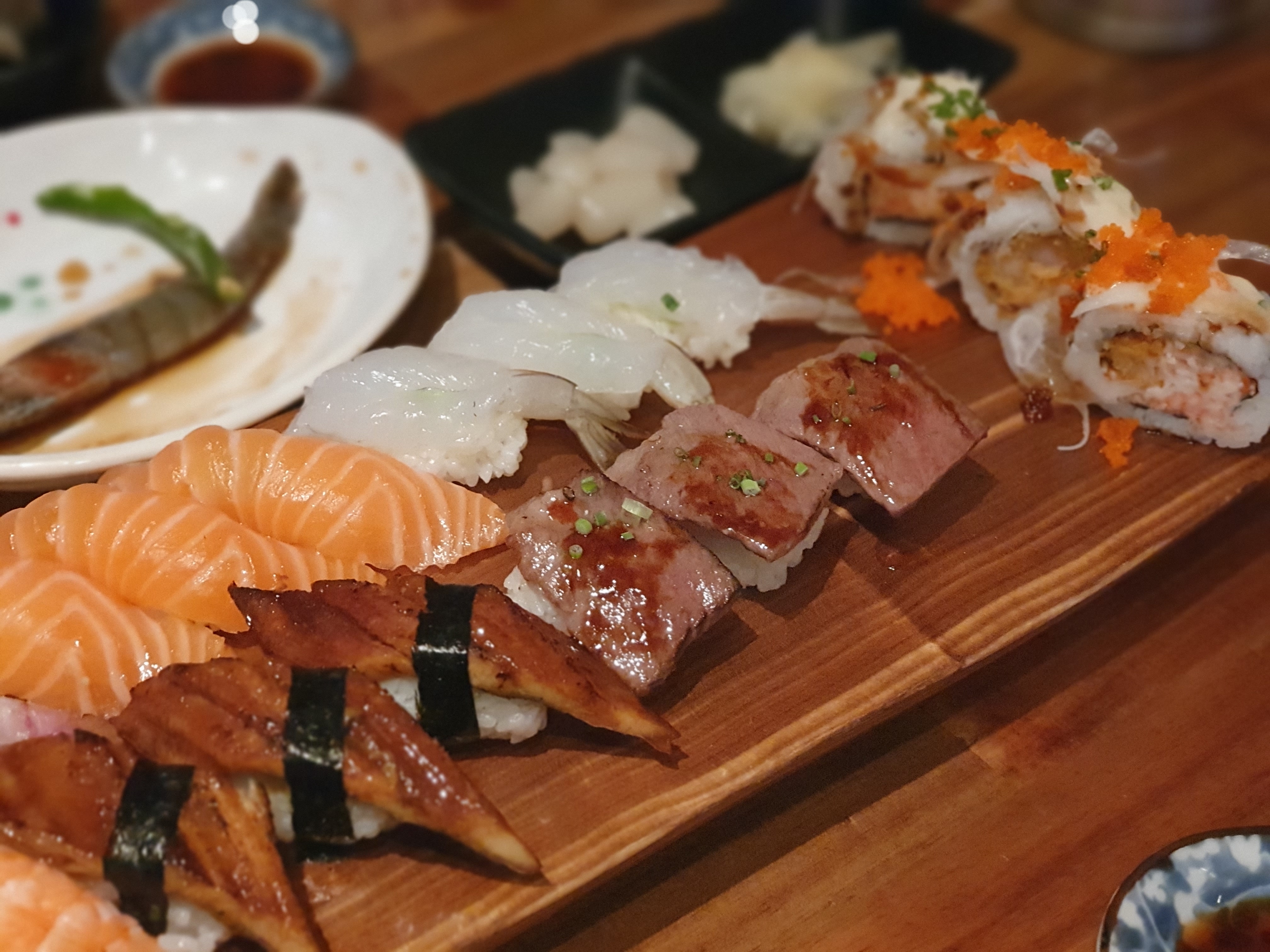1인기준으로 광어/연어/참치/생새우/새우/장어/소고기초밥이 있고, 롤이 나옵니다.
