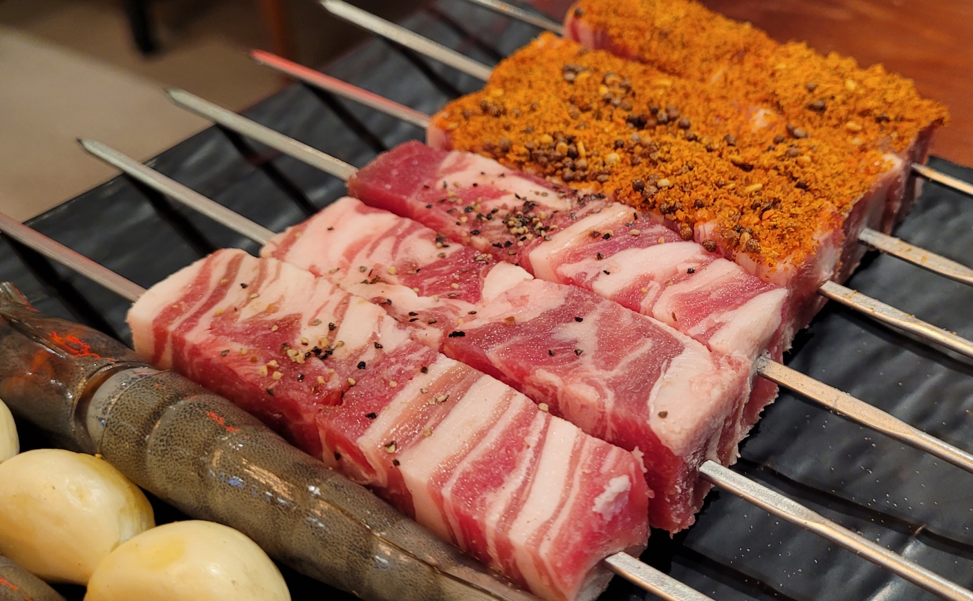 숯불에 양고기가 잘 익어가는 모습을 보니 좋습니다.