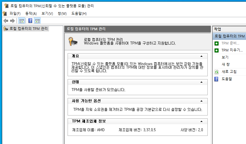 그러면 아래와 같이 TPM관리 창이 뜨고, 여기에서 사양버전 2.0이 있는것을 확인해 볼 수 있습니다.