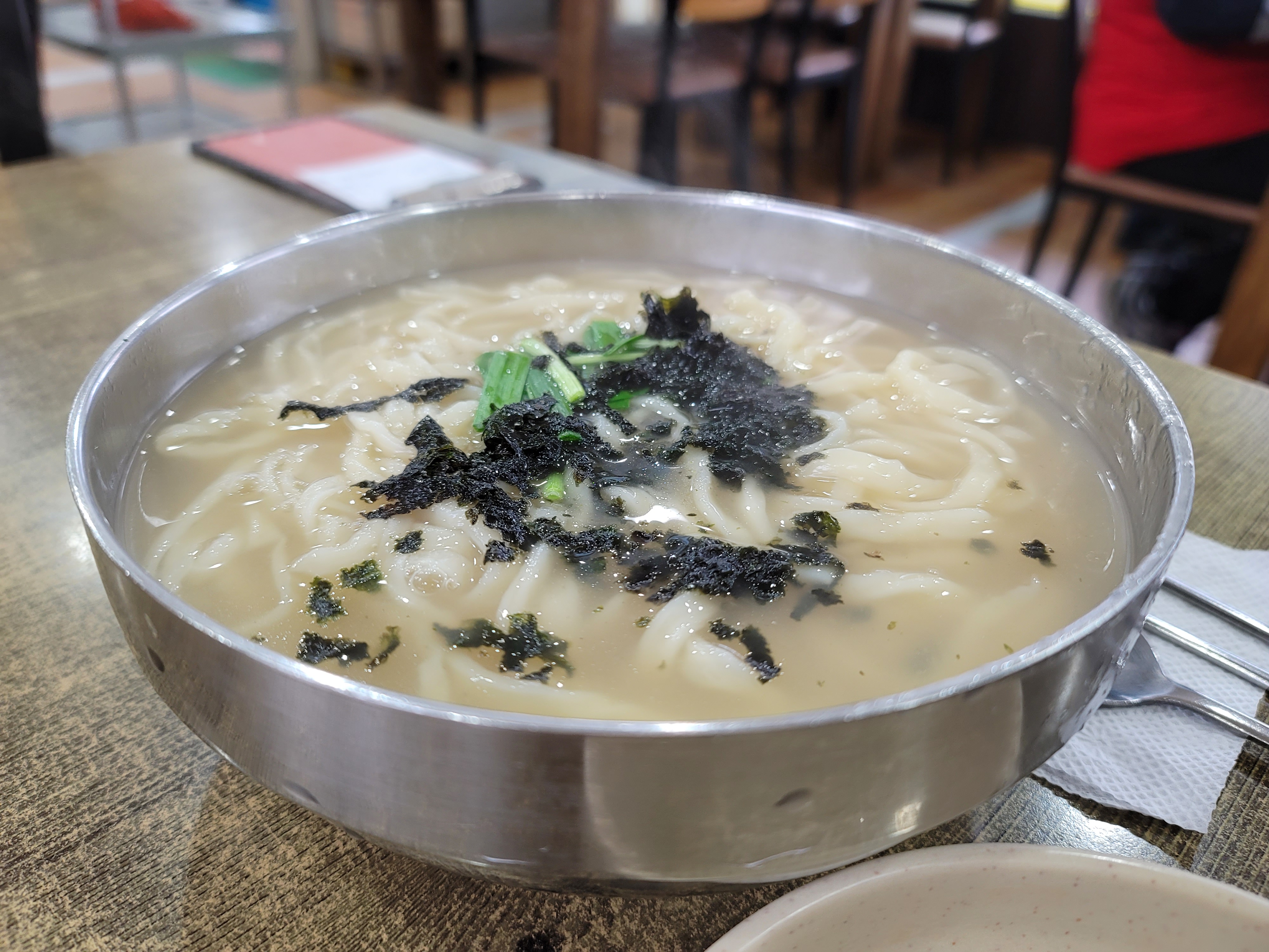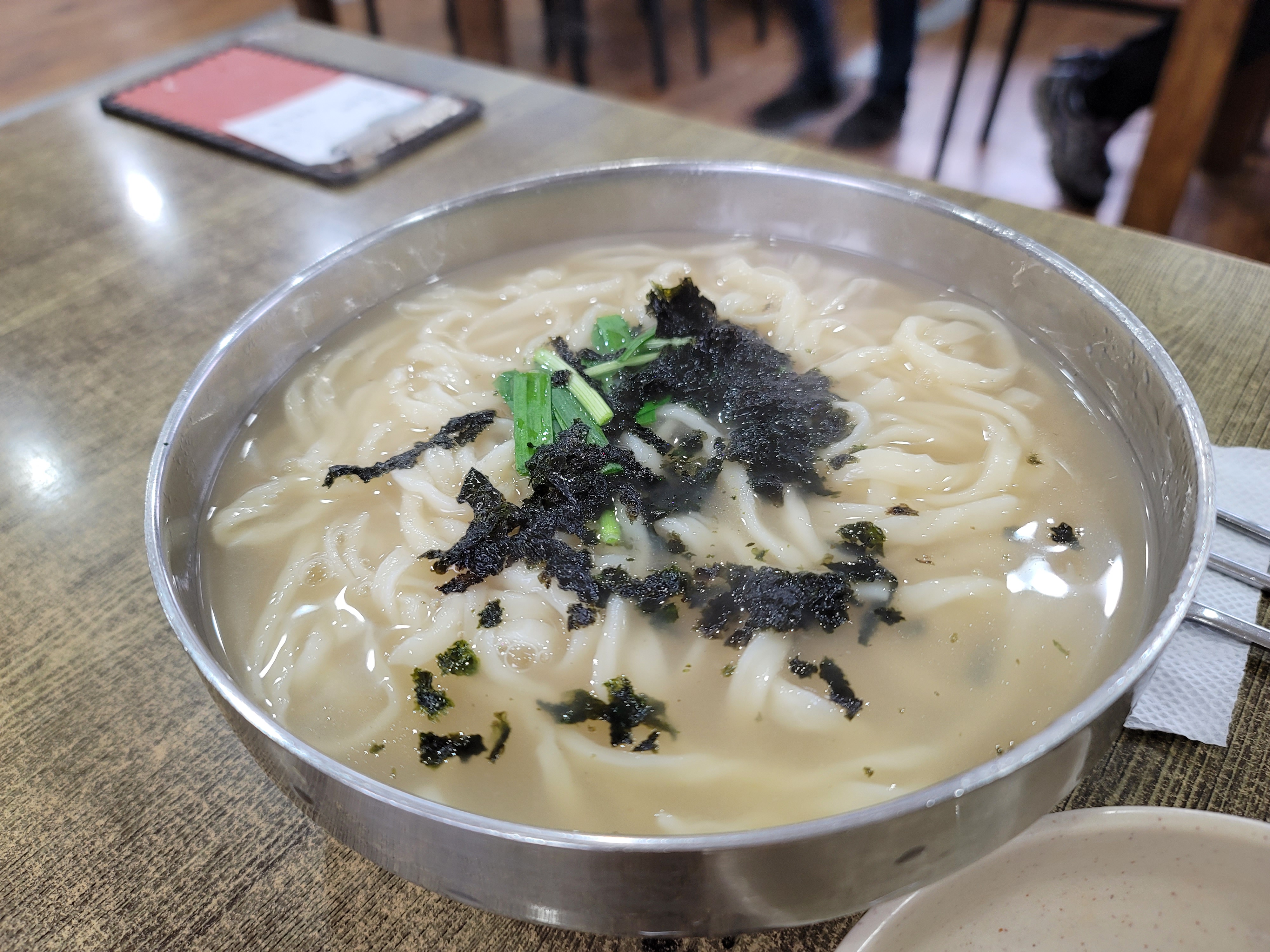 칼국수: 진한 멸치 육수에 부추와 김가루를 고명으로 올려 깔끔하고 담백한 맛을 자랑합니다.