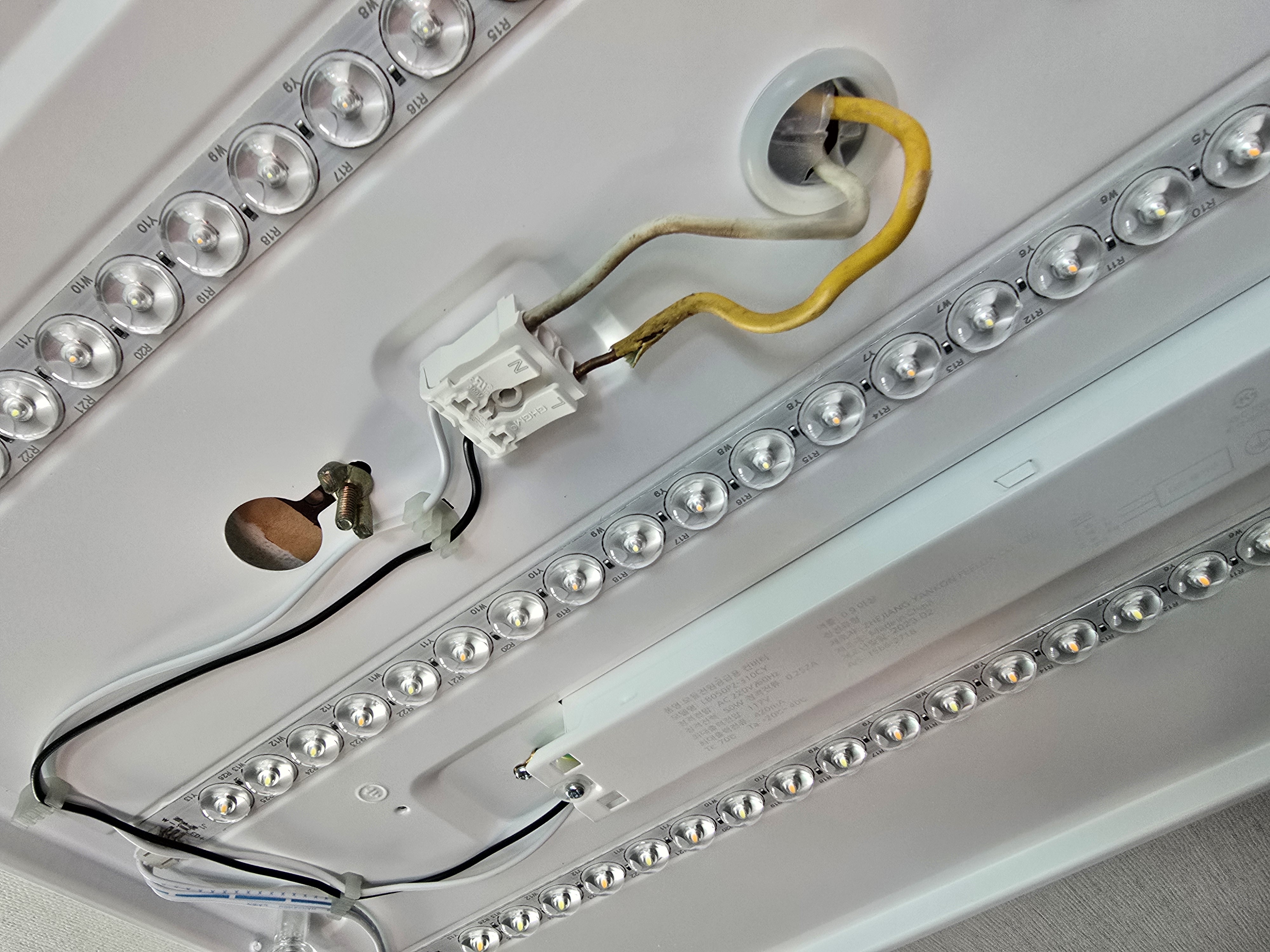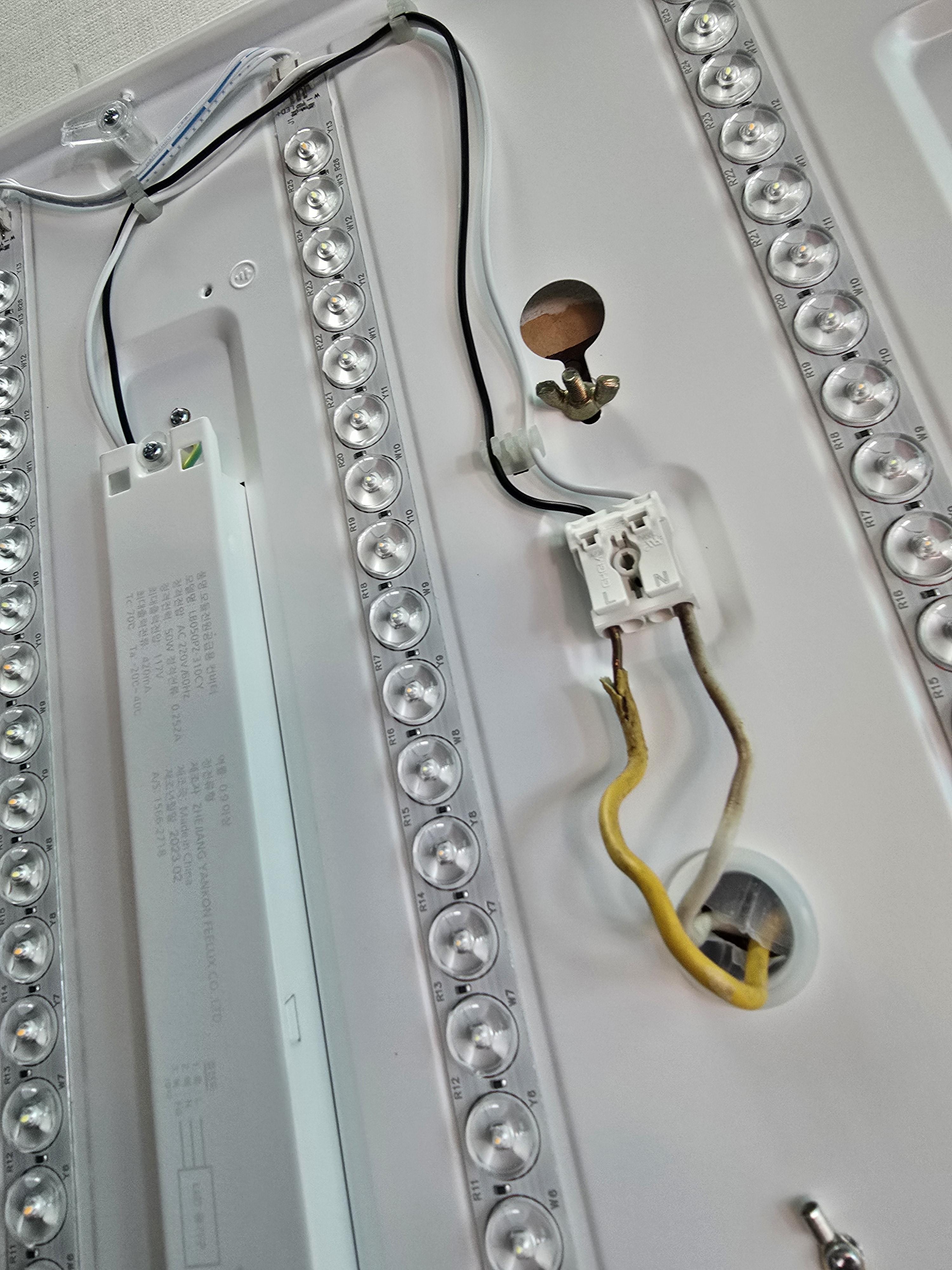 전선이 천장에서 나온 전원 커넥터와 안전하게 연결된 모습입니다. 검은색과 노란색 전선이 LED 모듈과 연결된 것을 볼 수 있습니다. 모든 연결이 끝나면 차단기를 올려 전원을 다시 연결하고, 조명이 정상적으로 켜지는지 확인합니다. 불이 정상적으로 켜지면 교체가 완료된 것입니다.