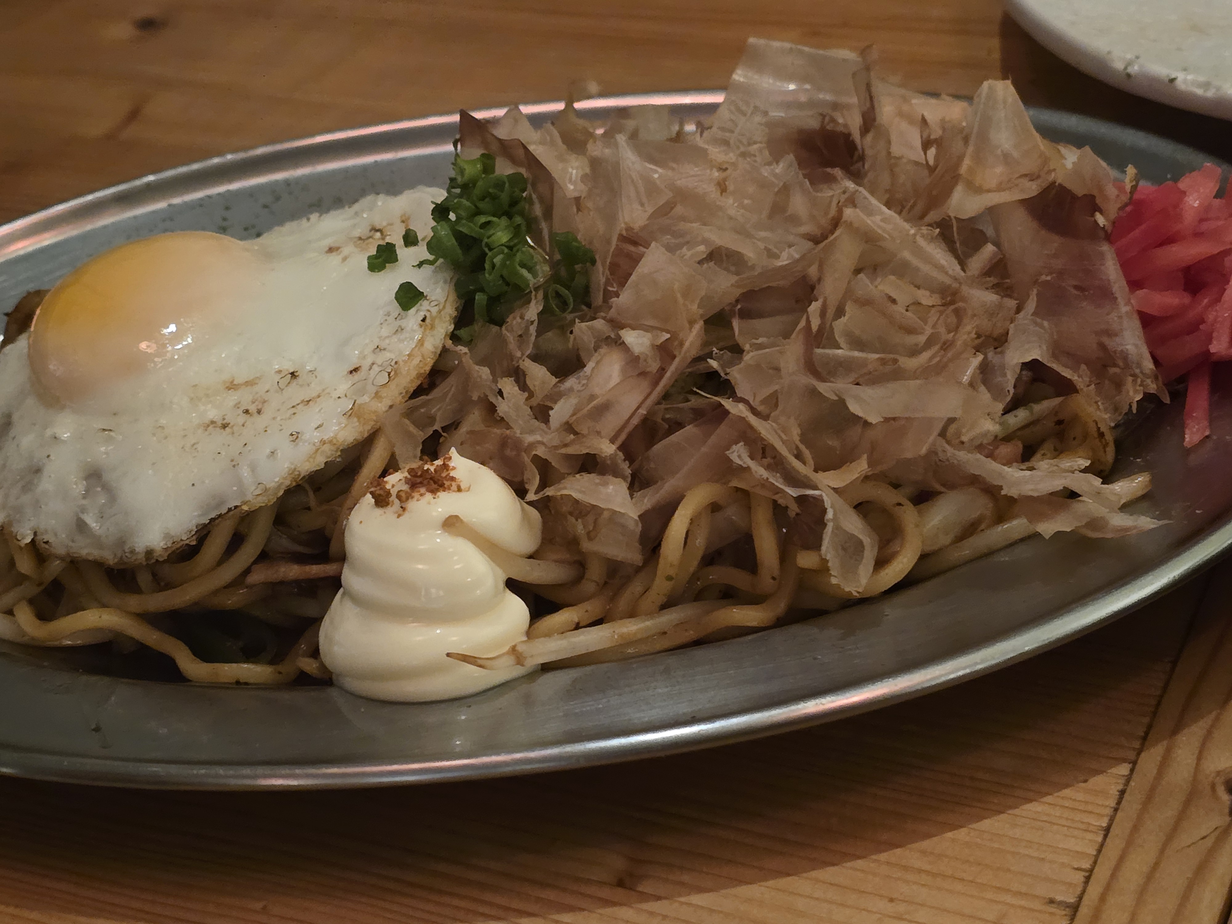 첫 번째 사진은 야키소바입니다. 일본식 볶음면으로, 면 위에 반숙 계란이 올려져 있어 비주얼부터 군침이 돌았어요. 마요네즈와 가쓰오부시(가다랑어포)가 듬뿍 올려져 풍미를 더해주고, 새콤달콤한 소스가 면과 잘 어우러져 정말 맛있었습니다. 가격은 약 13,000원 정도로 기억합니다.