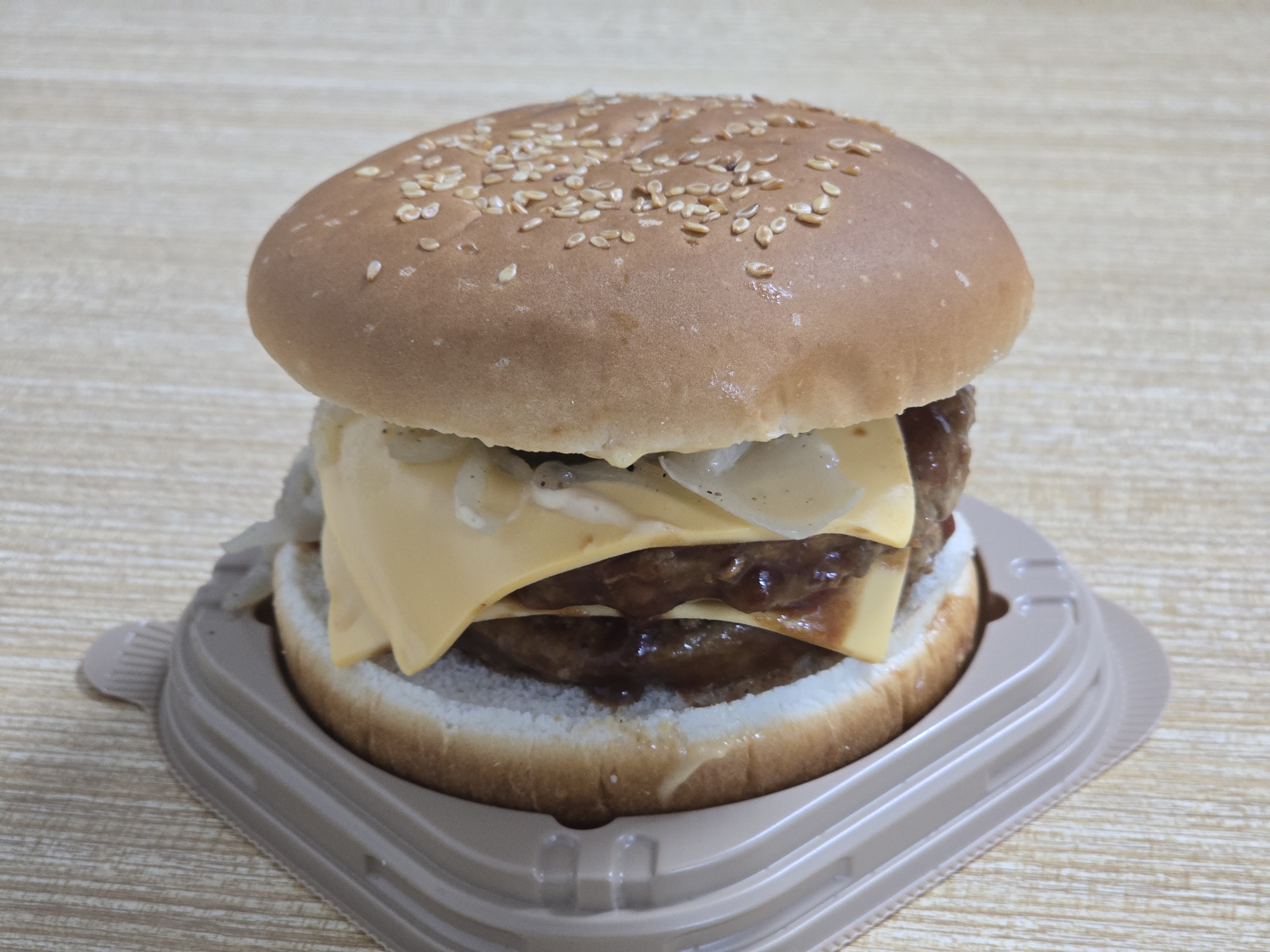 포장을 열면 깨가 뿌려진 번 사이로 두툼한 패티 두 장과 치즈, 피클, 양파가 층층이 쌓여 있습니다. 전자레인지에 약 1분 20초 정도 데우면 치즈가 녹아내리며 먹음직스러운 비주얼을 자랑합니다.
