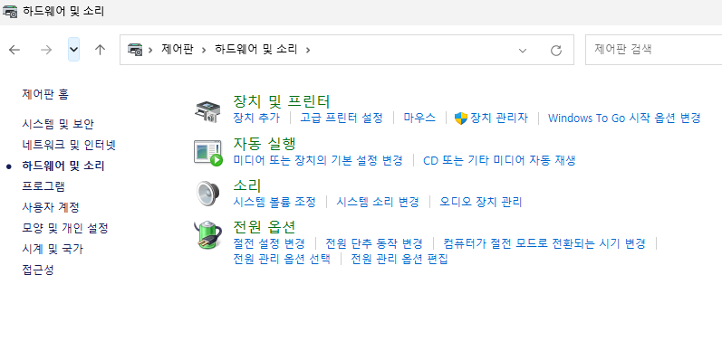 제어판 열기: 작업 표시줄의 검색 창에 '제어판'을 입력하고 선택합니다.