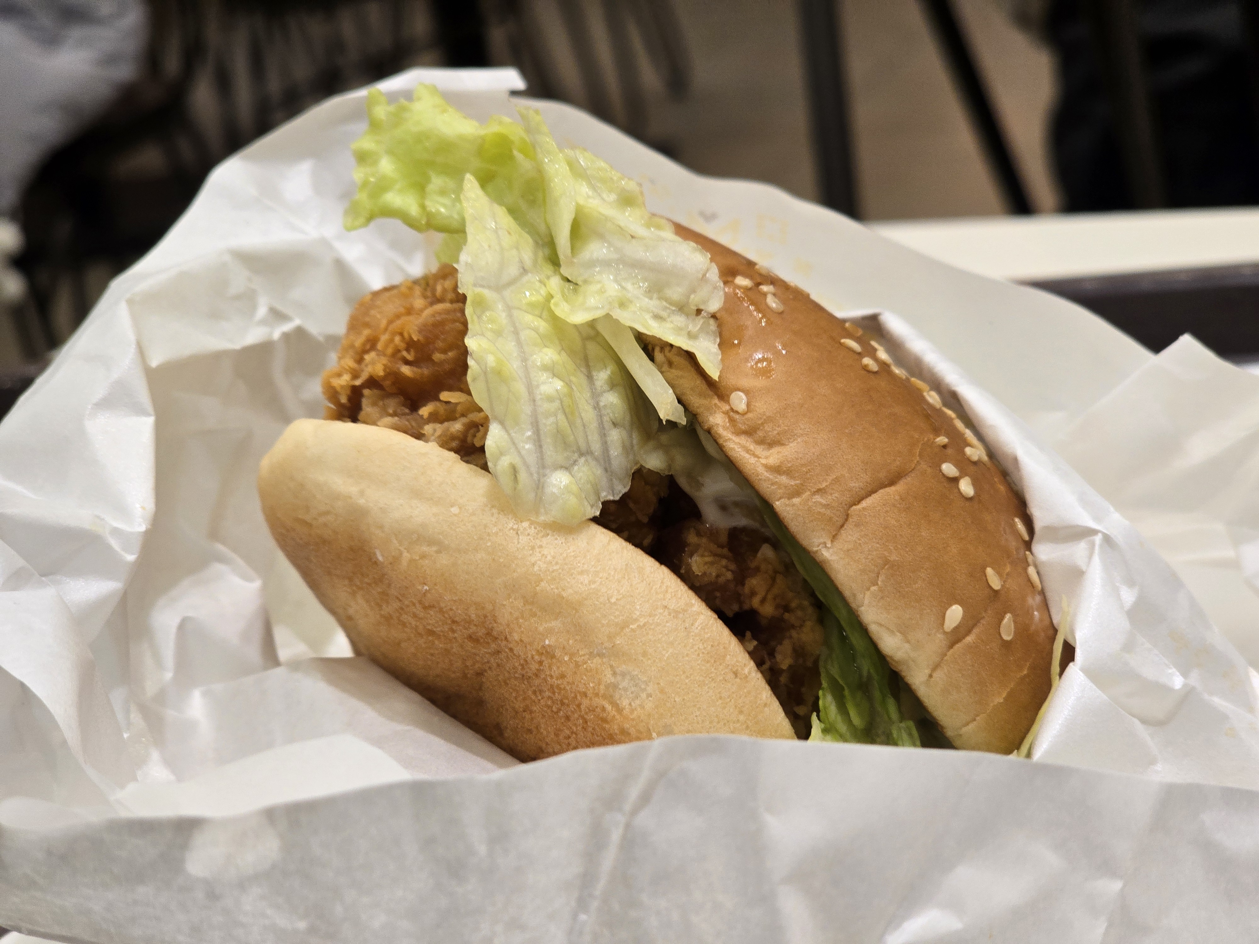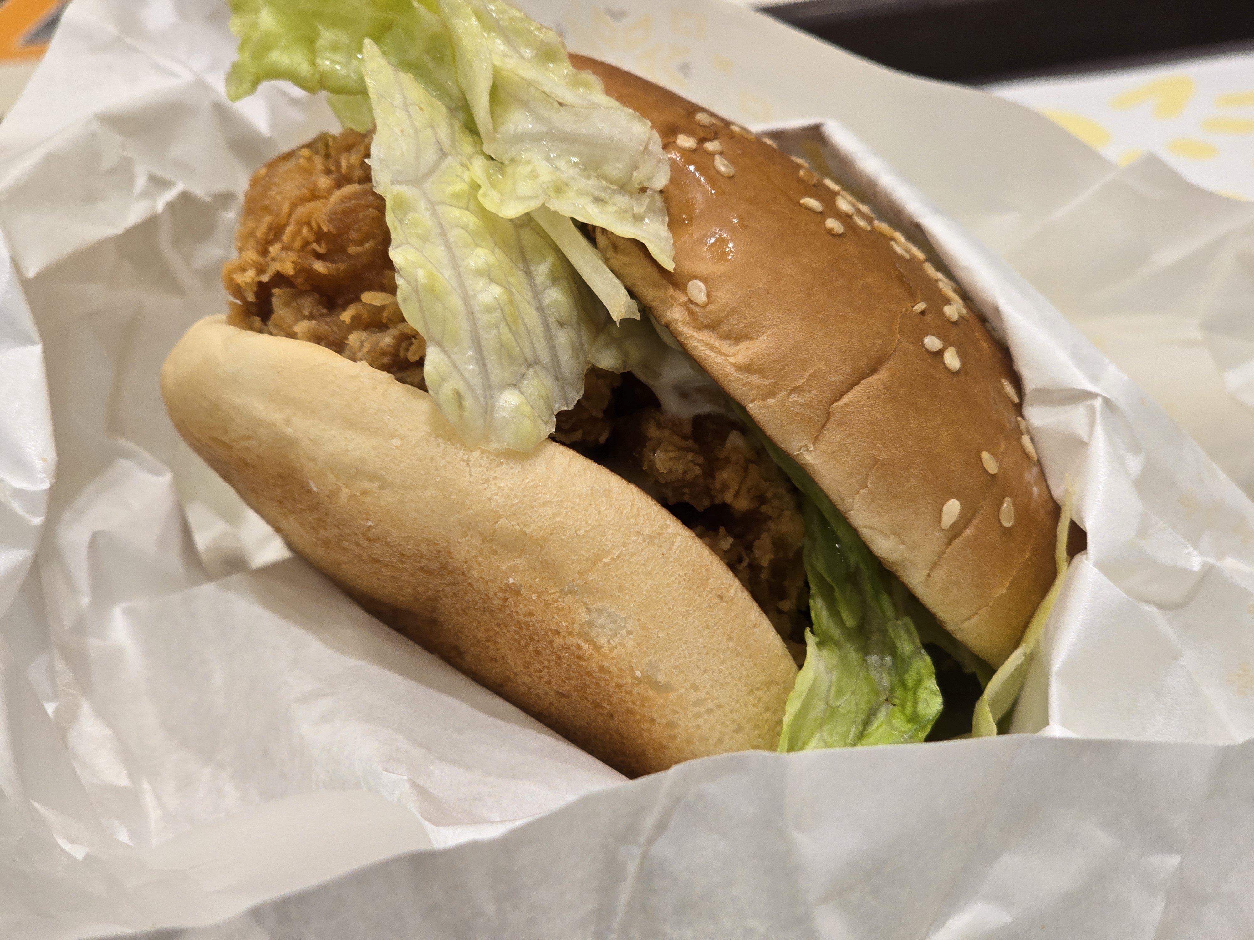 번은 부드러우면서도 약간의 쫄깃함이 느껴져 치킨 패티와 잘 어울렸습니다. 먹는 동안 쉽게 부스러지지 않아 식사를 깔끔하게 마무리할 수 있었습니다.