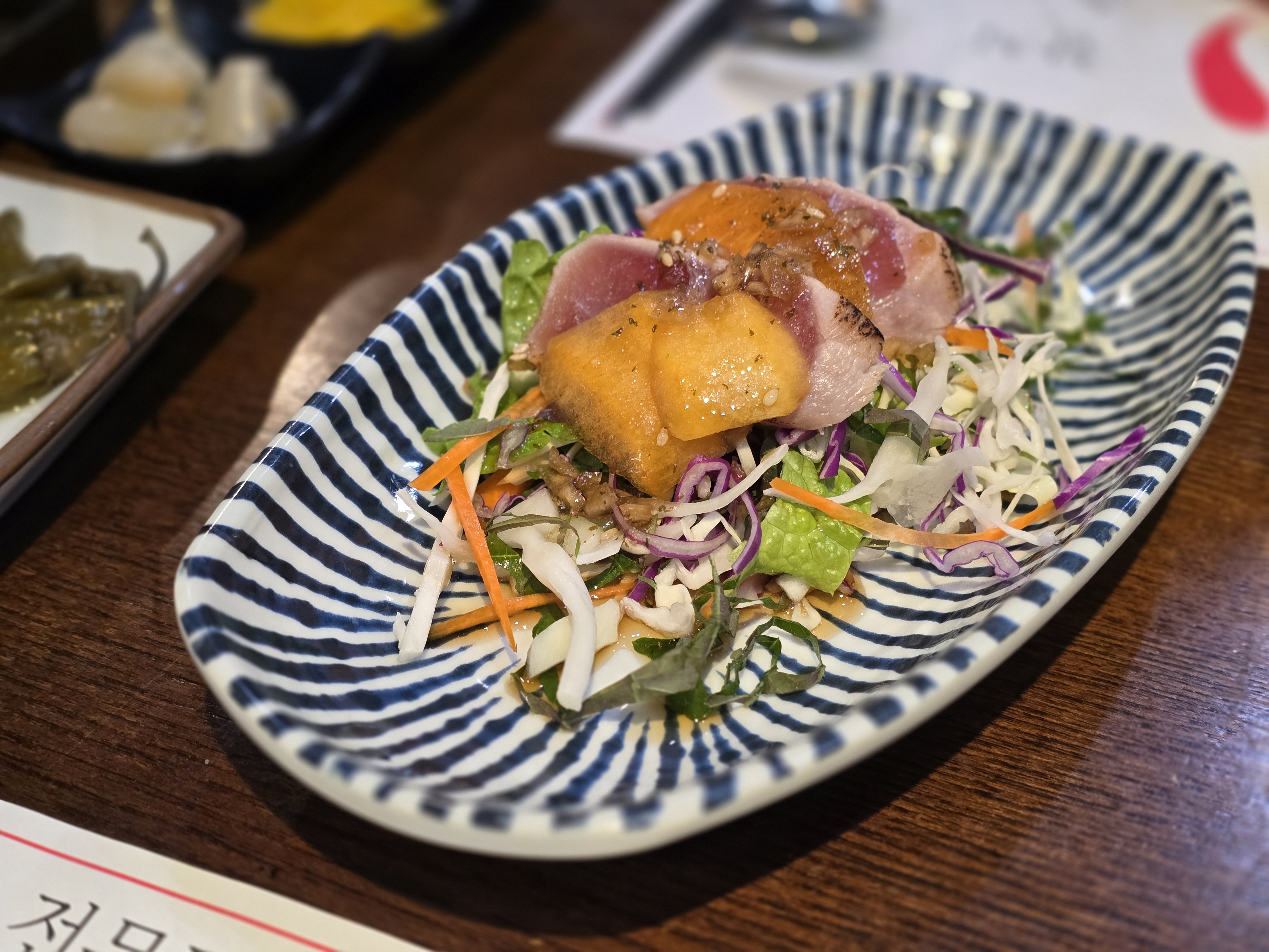 살짝 구워진 참치와 신선한 채소가 어우러진 샐러드로, 새콤달콤한 드레싱이 가미되어 상큼한 맛을 즐길 수 있습니다. 참치 본연의 맛을 가볍게 즐기기에 좋은 선택이었습니다.
