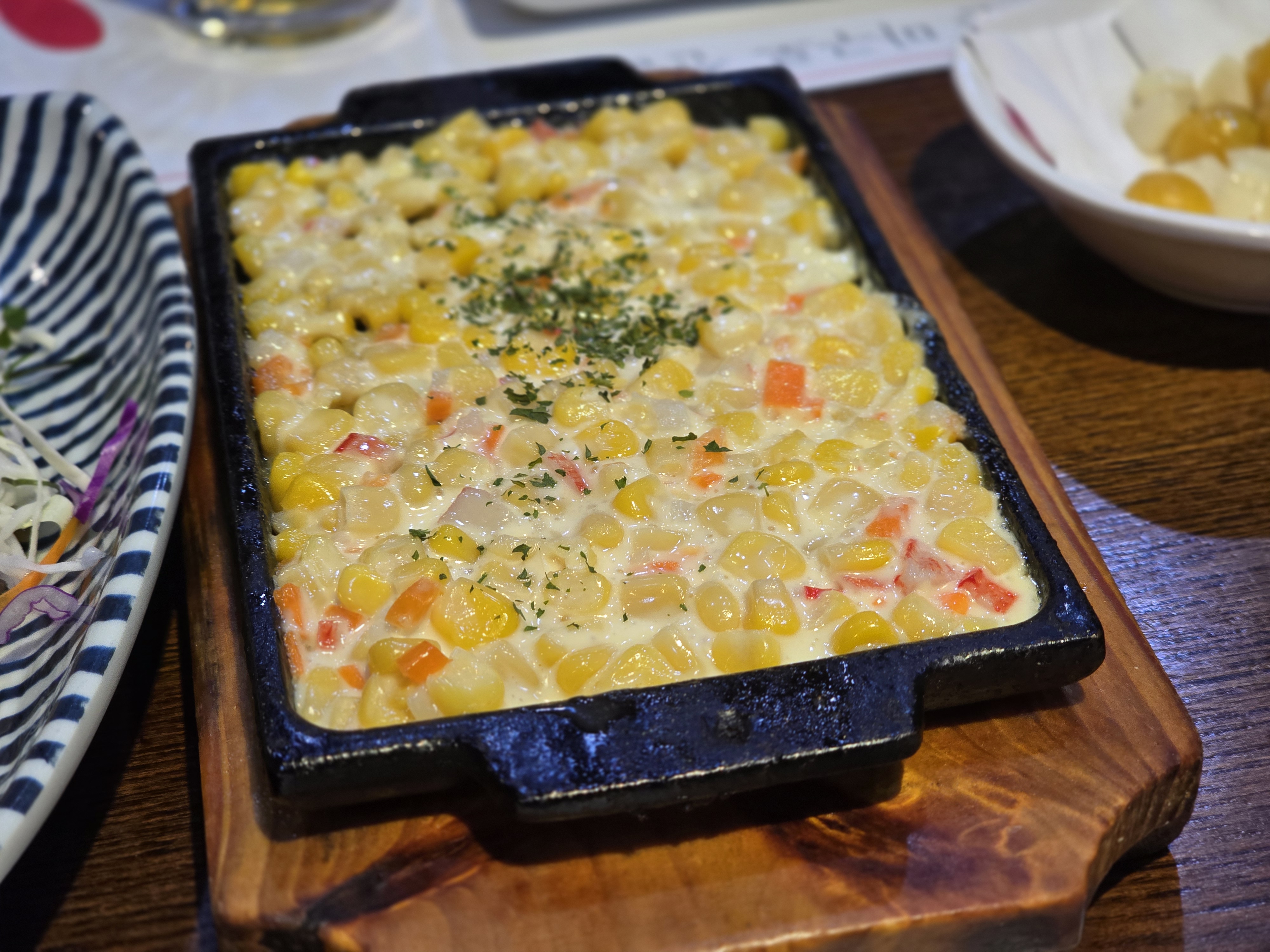 따뜻하게 구워진 콘치즈는 달콤한 옥수수와 고소한 치즈의 조화가 인상적입니다. 참치 요리와 곁들여 먹기에 부담 없는 사이드 메뉴로 추천합니다.