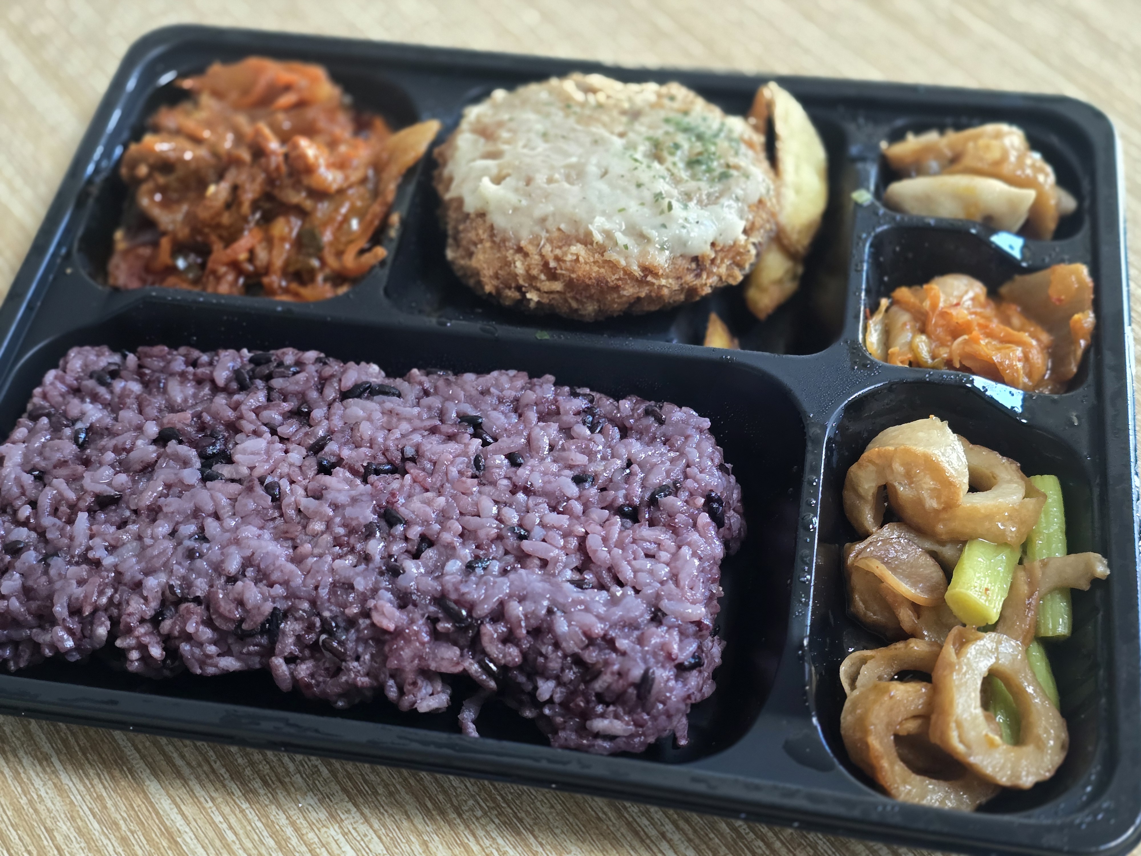 멘츠카츠&제육 5찬 도시락은 바쁜 일상에서 간단히 해결할 수 있는 든든한 한 끼 식사로, 멘츠카츠의 바삭함과 대파크림 소스의 부드러움, 제육볶음의 매콤한 맛이 조화를 이룹니다. 추가된 반찬들도 다양하고 맛이 좋아 질리지 않게 먹을 수 있는 점이 매력적입니다. 특히 흑미밥과 반찬 구성 덕분에 건강까지 생각한 도시락이라는 느낌을 받았습니다.