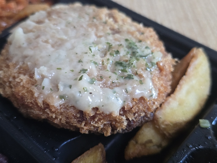 멘츠카츠: 바삭한 튀김과 부드러운 대파크림 소스의 조화가 특징입니다. 소스가 풍미를 더해주어 매우 만족스럽습니다.