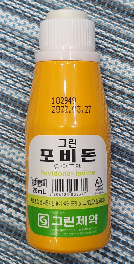 보통 유명한 소독약은 빨간약으로 알려져 있고, 이름은 포비돈 액입니다.