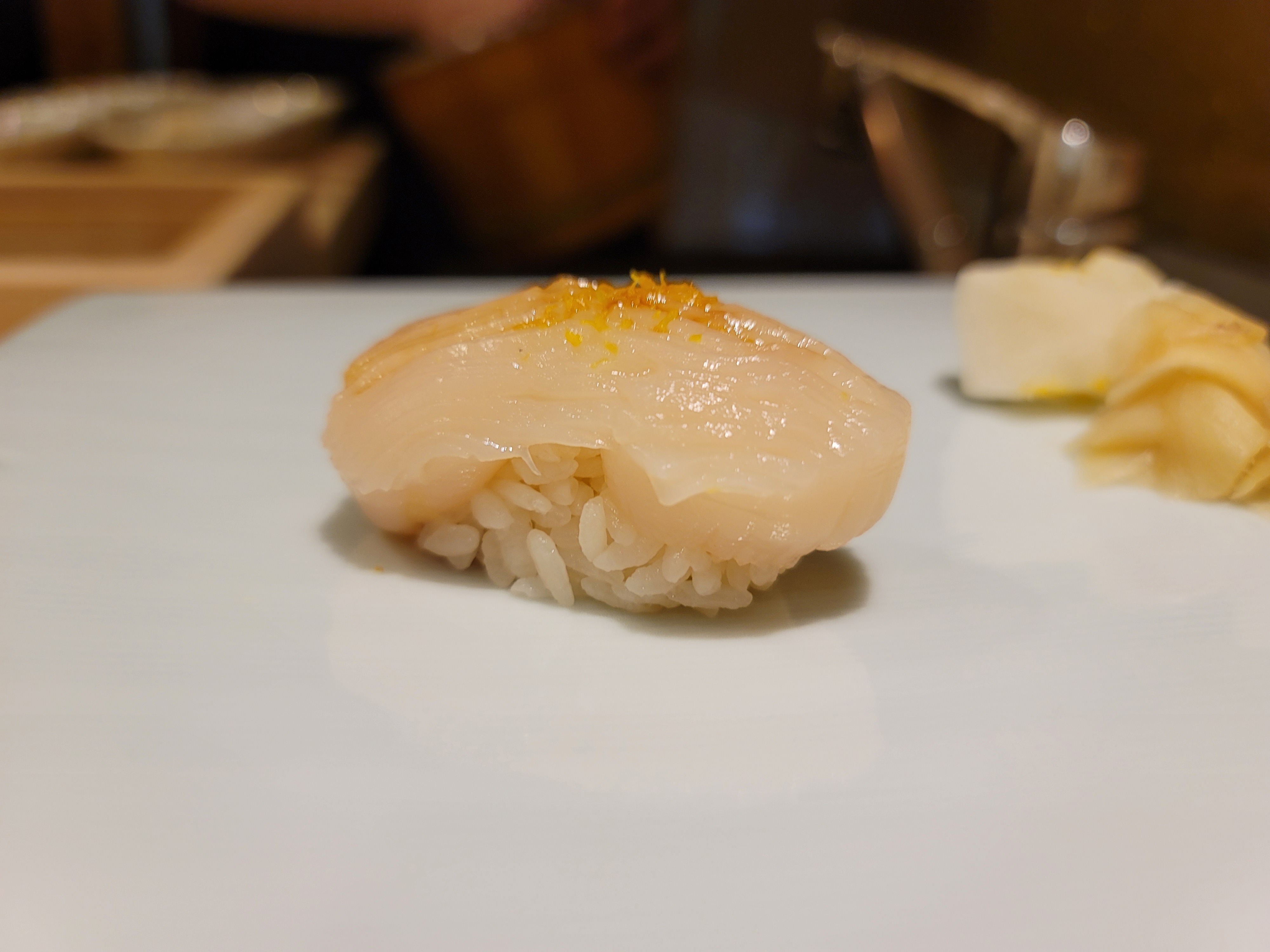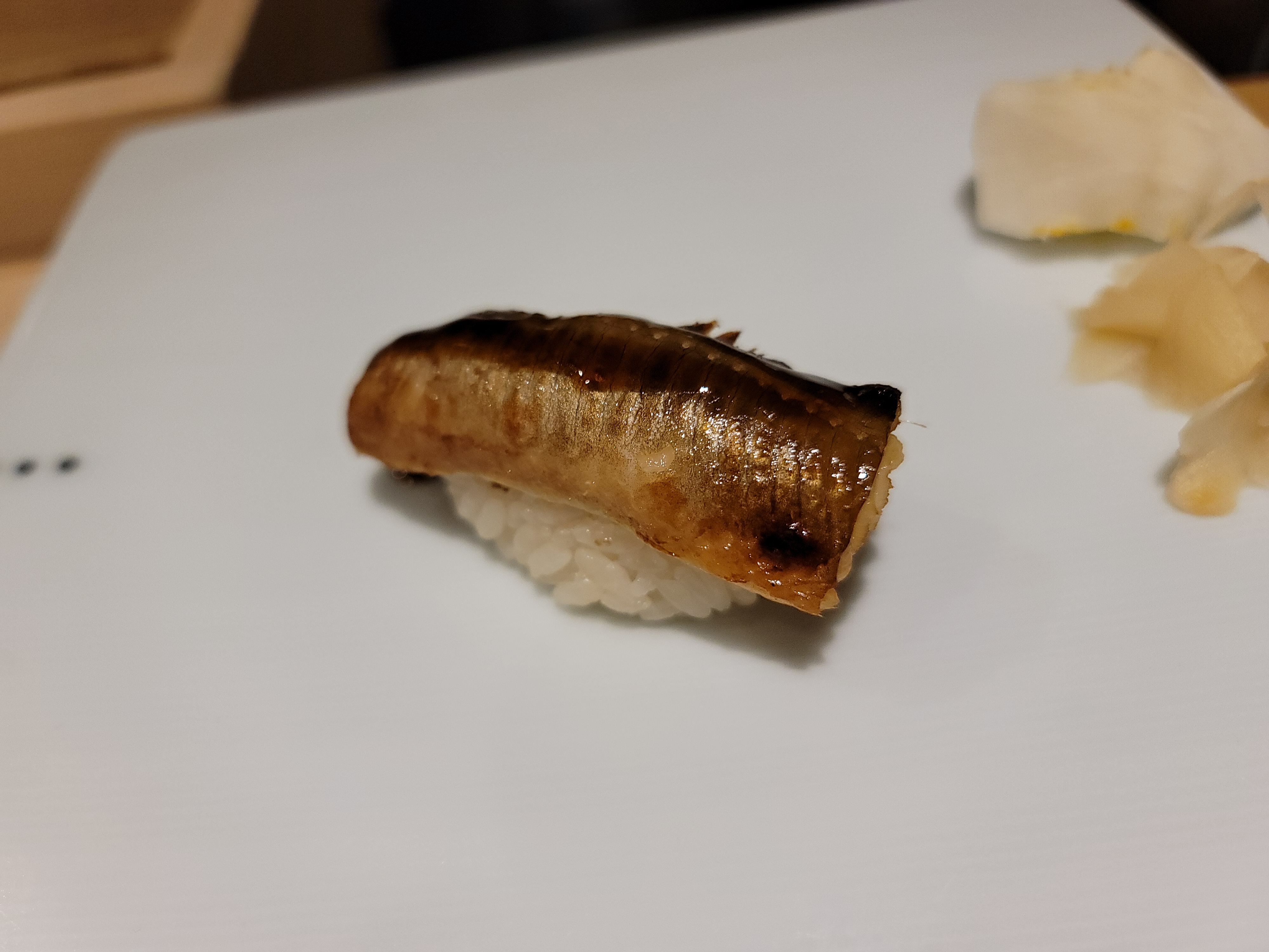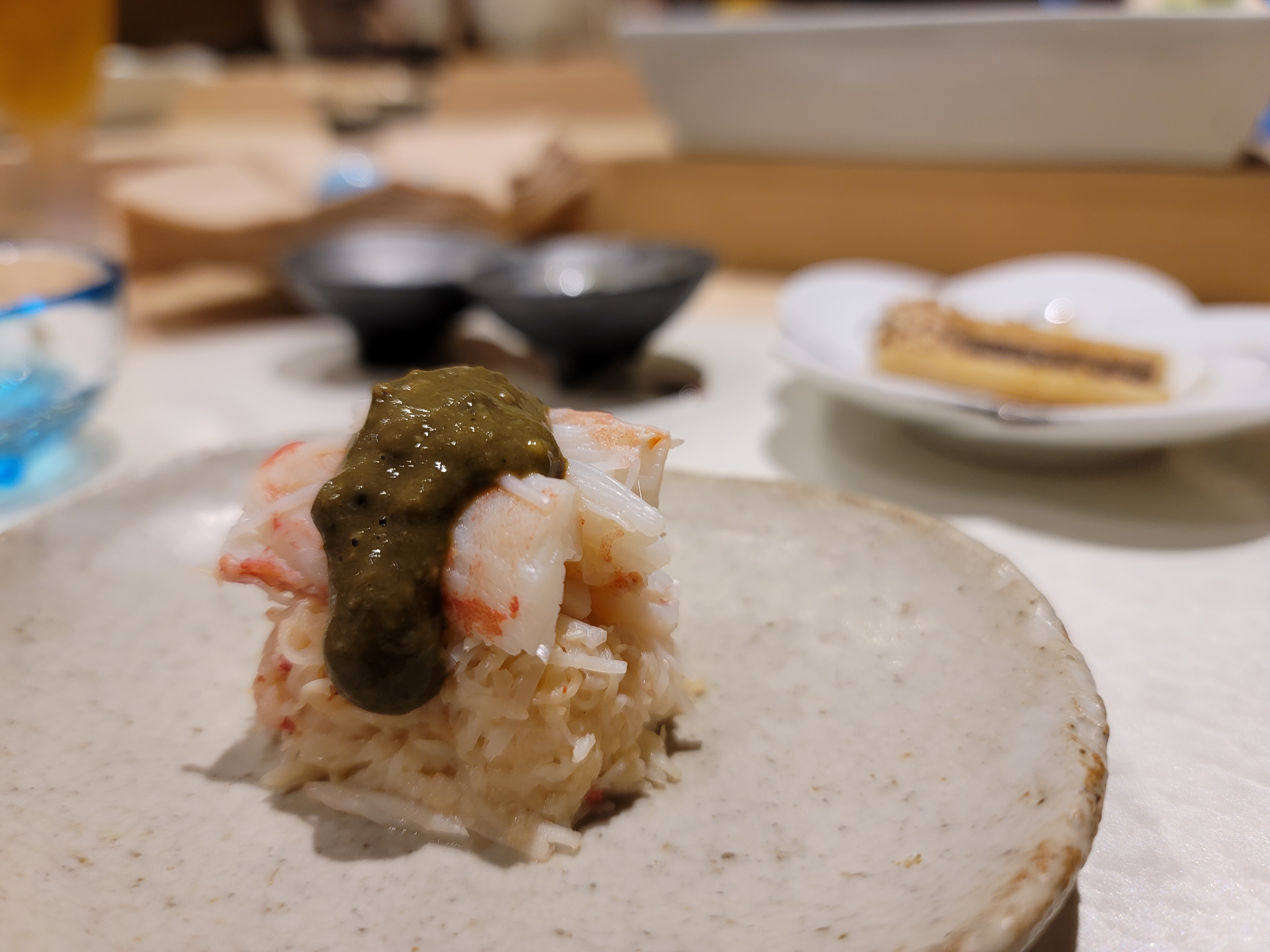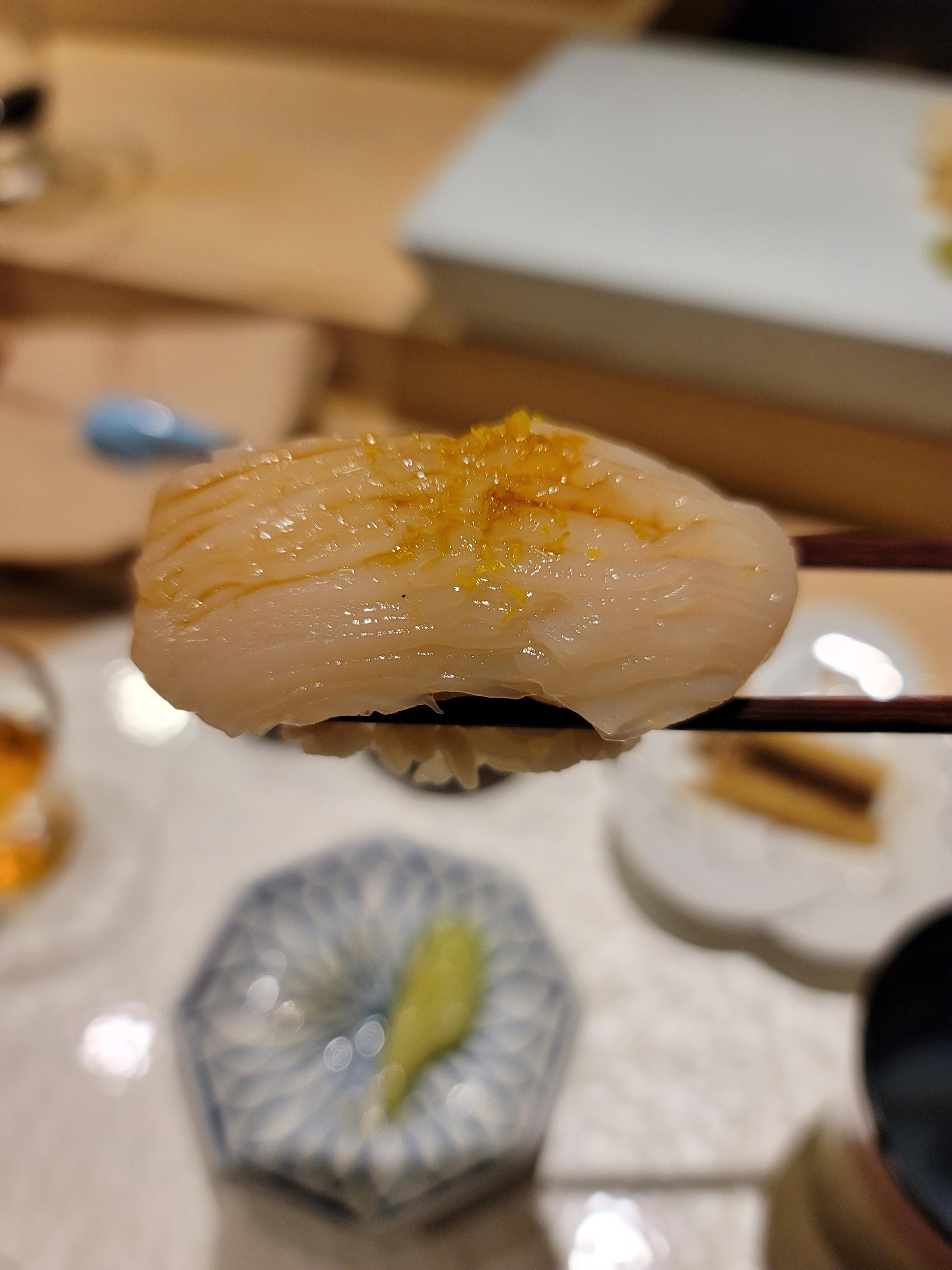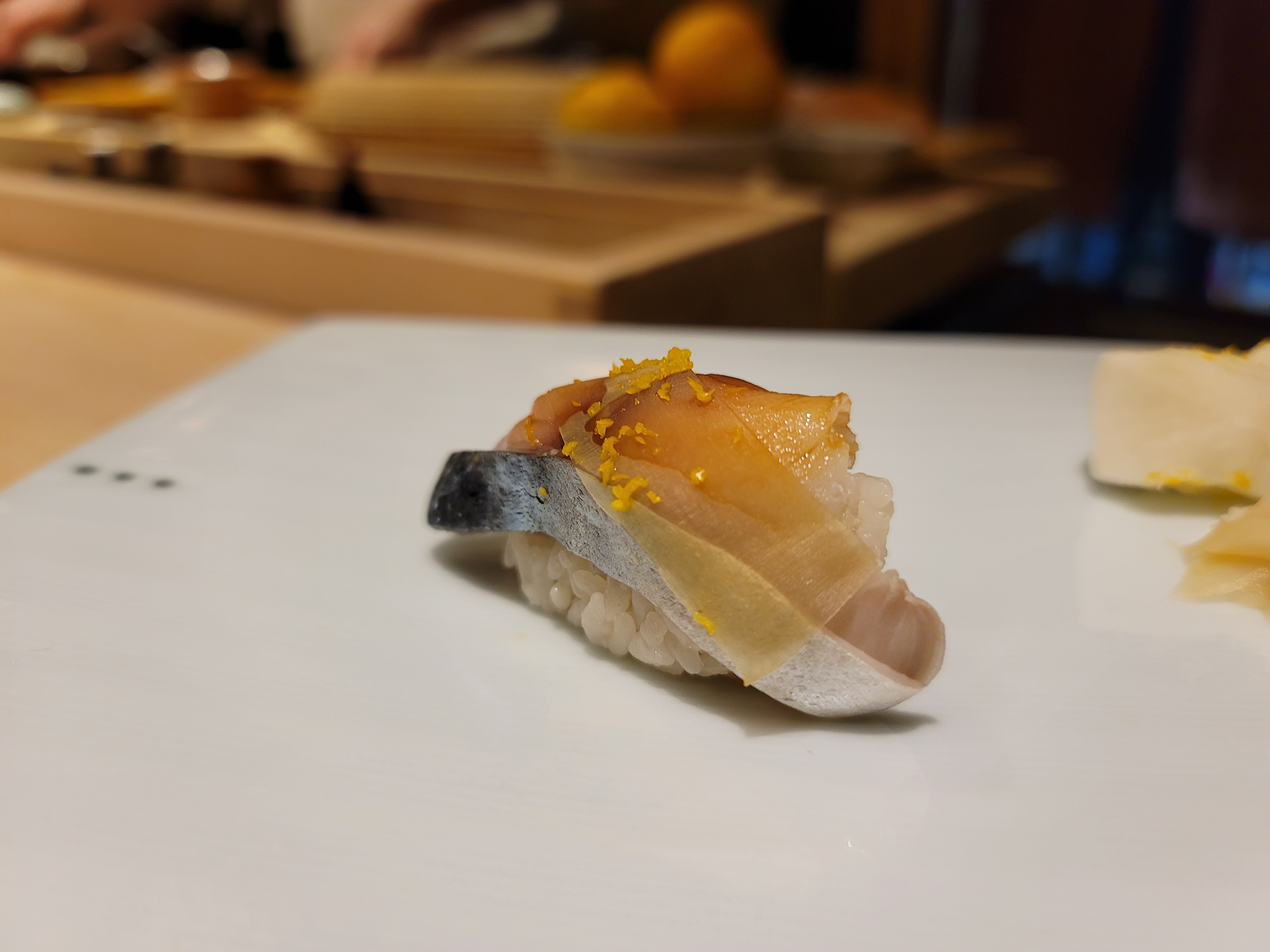 셰프님이 손님과 가벼운 대화를 나누면서도 신중하게 스시를 만드는 모습이 인상적이었습니다. 셰프의 손길을 보며 스시가 만들어지는 과정을 보는 것은 오마카세의 묘미라고 할 수 있습니다.